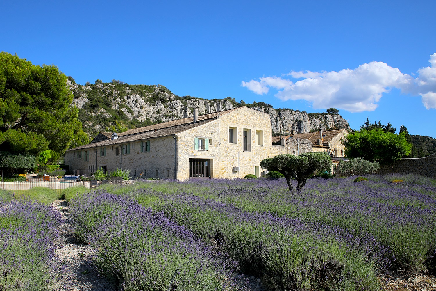 Sur place, une grande piscine permet d’admirer : d'un côté la plaine et le village de Pujaut, de l'autre la falaise rougie par le coucher de soleil...